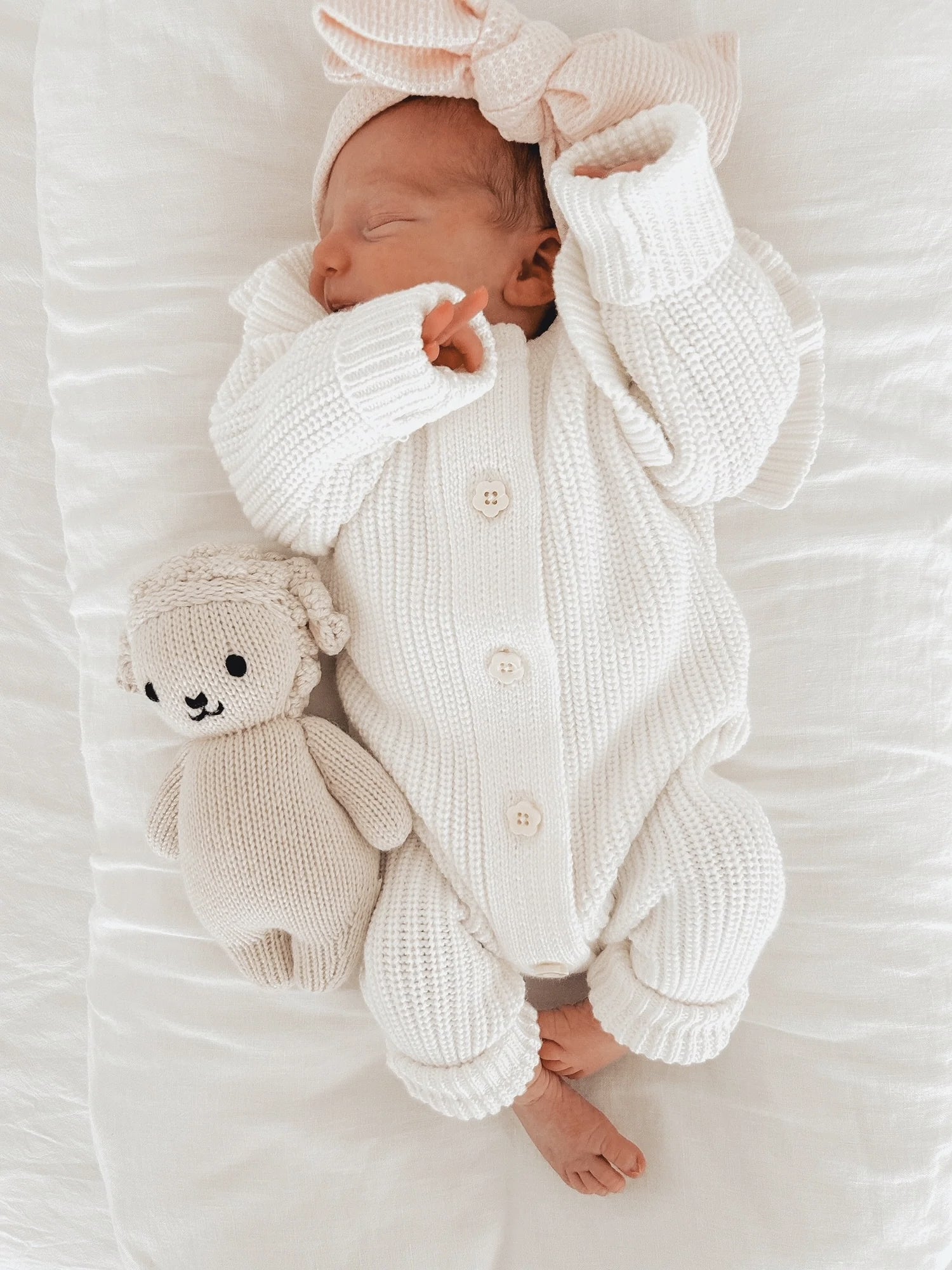 La nostra tutina in maglia a costine con volant è realizzata in morbido cotone per il massimo comfort del tuo piccolo.