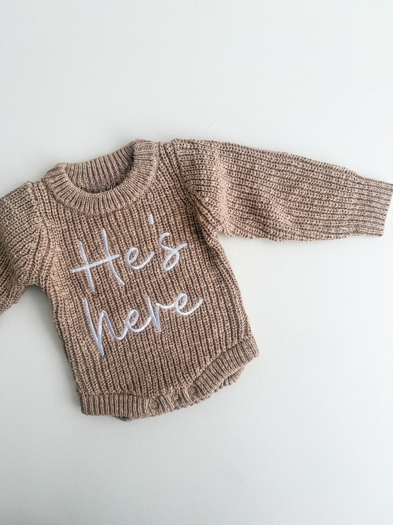 Pagliaccetto realizzato in 100% cotone testurizzato e ricamo “He’s here” incluso nel prezzo.