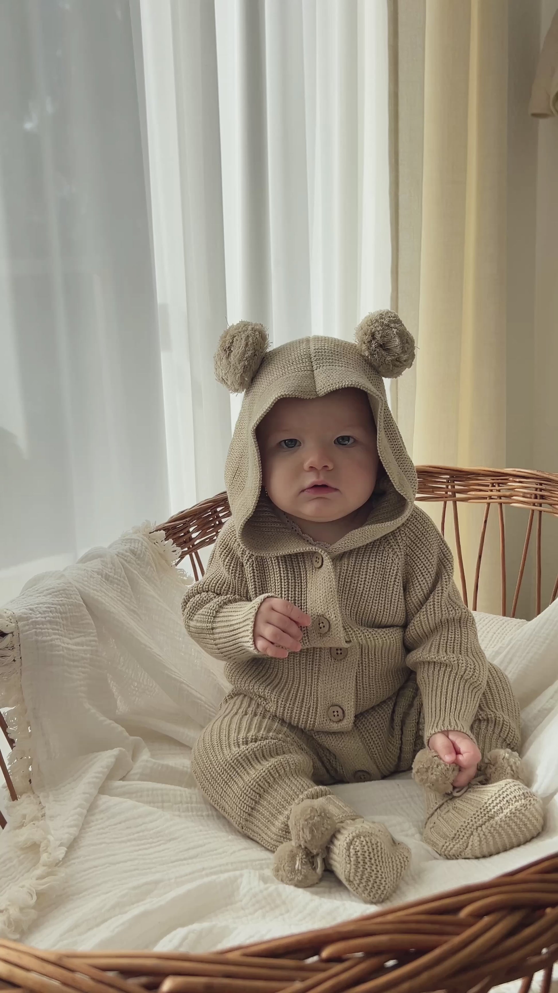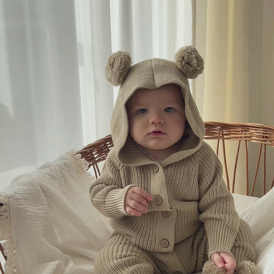 Tutina orsetto con cappuccio realizzata in 100% cotone biologico, con bottoni in legno sul davanti, perfetto per l'uso quotidiano e pratico per un cambio rapido e semplice.