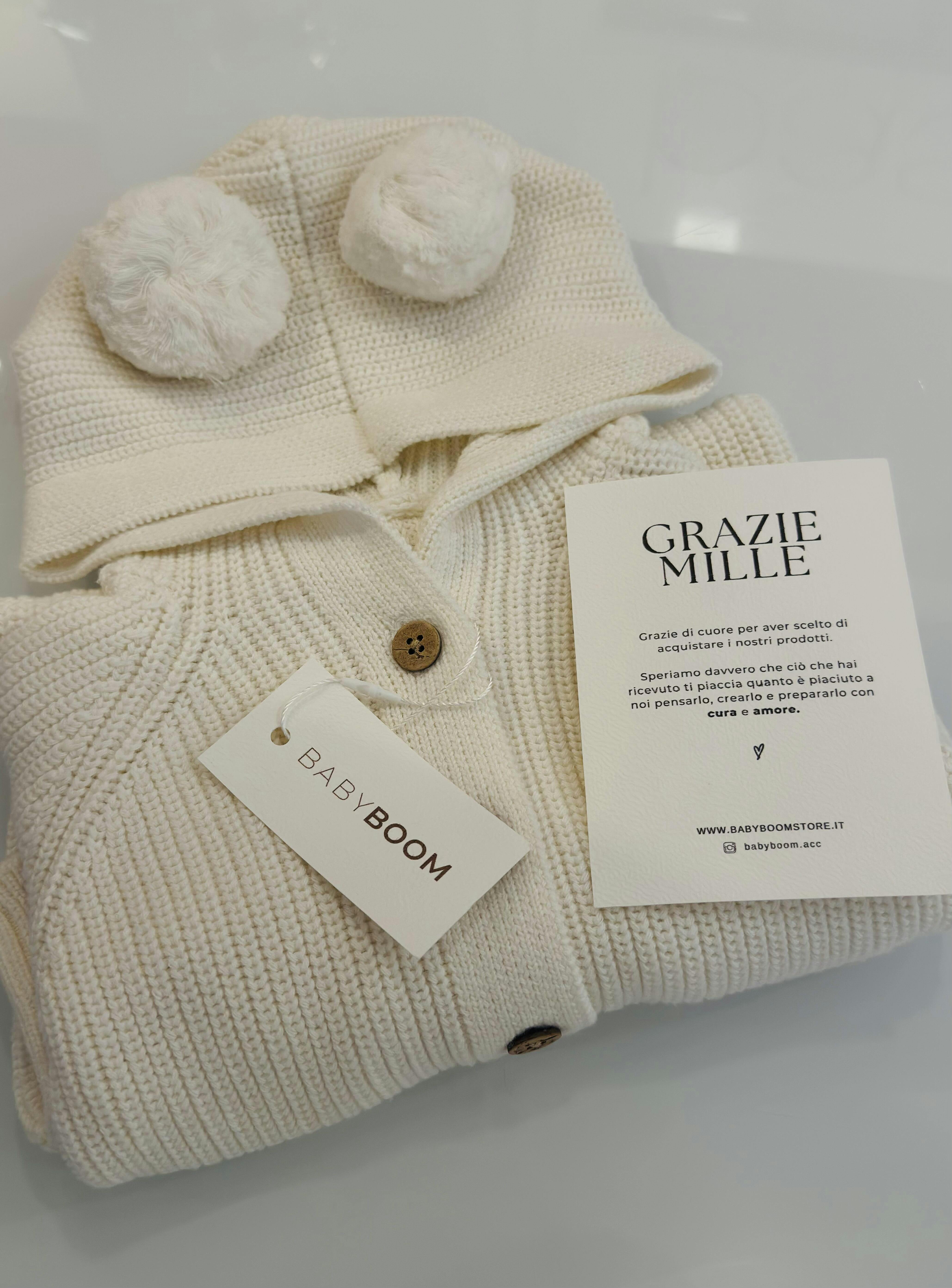 Tutina orsetto con cappuccio realizzata in 100% cotone biologico, con bottoni in legno sul davanti, perfetto per l'uso quotidiano e pratico per un cambio rapido e semplice.