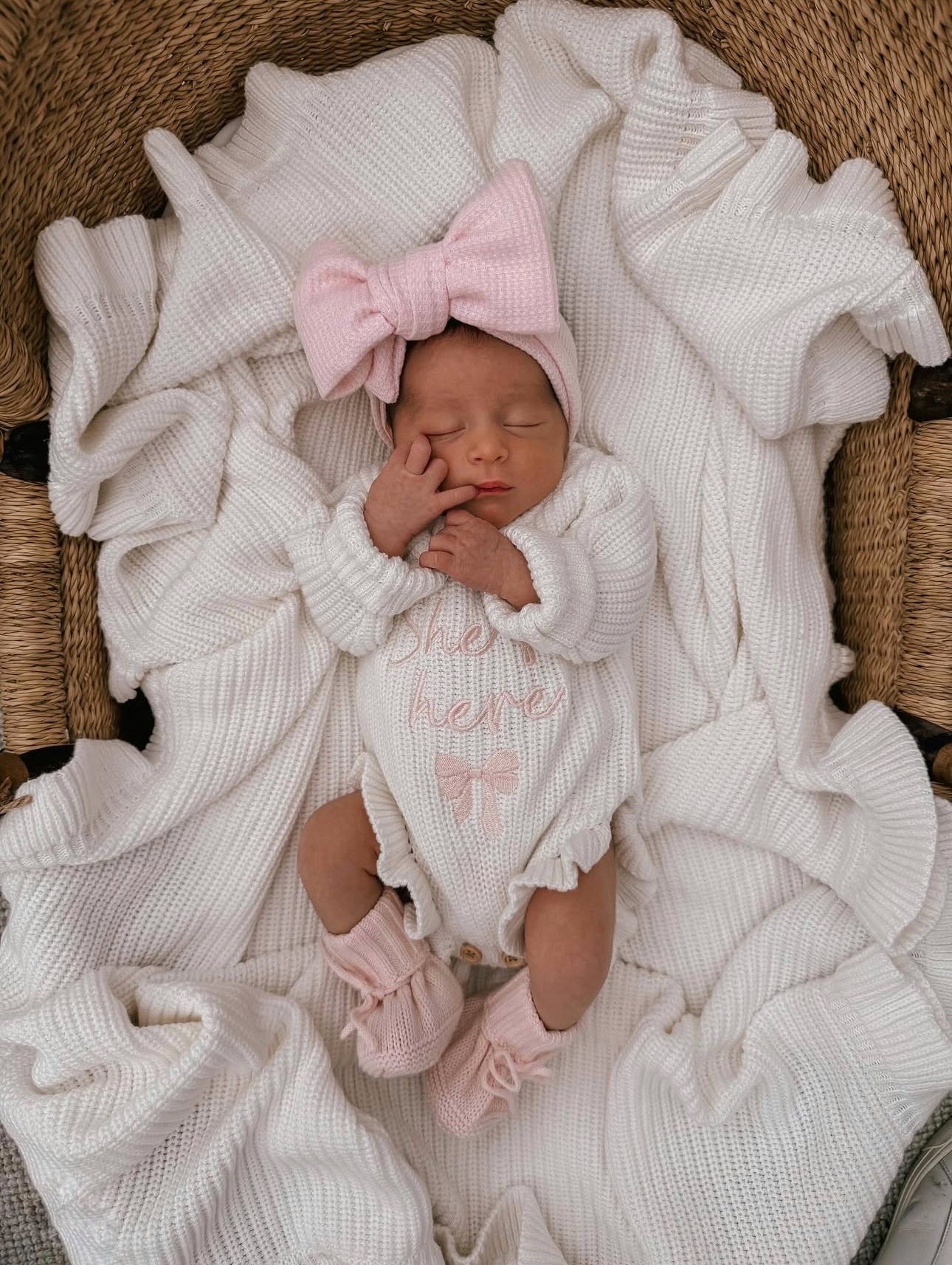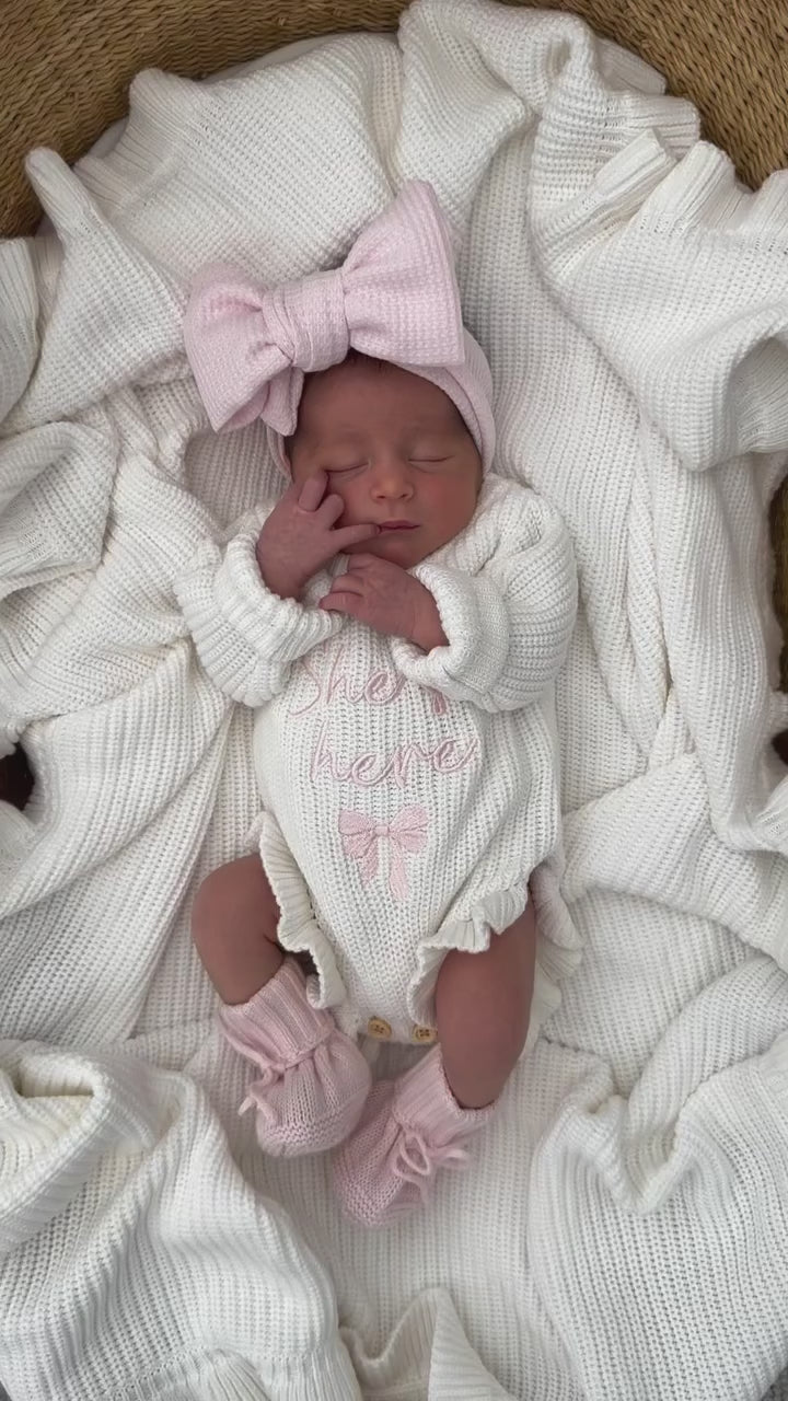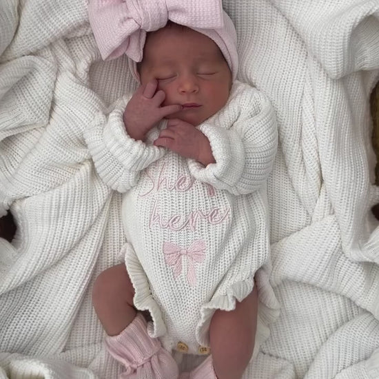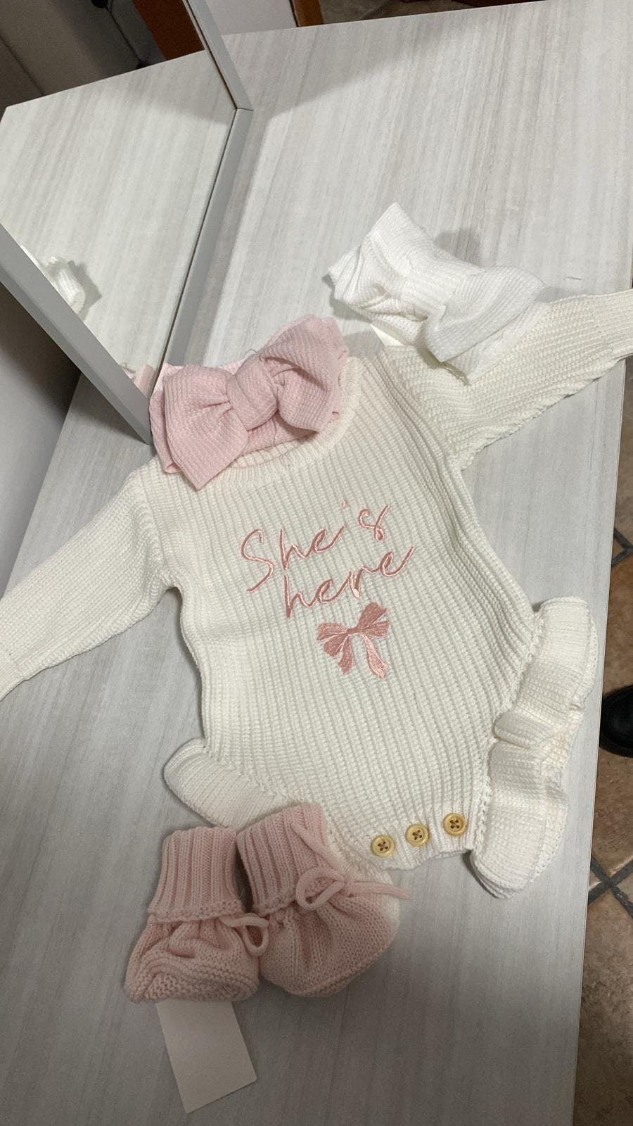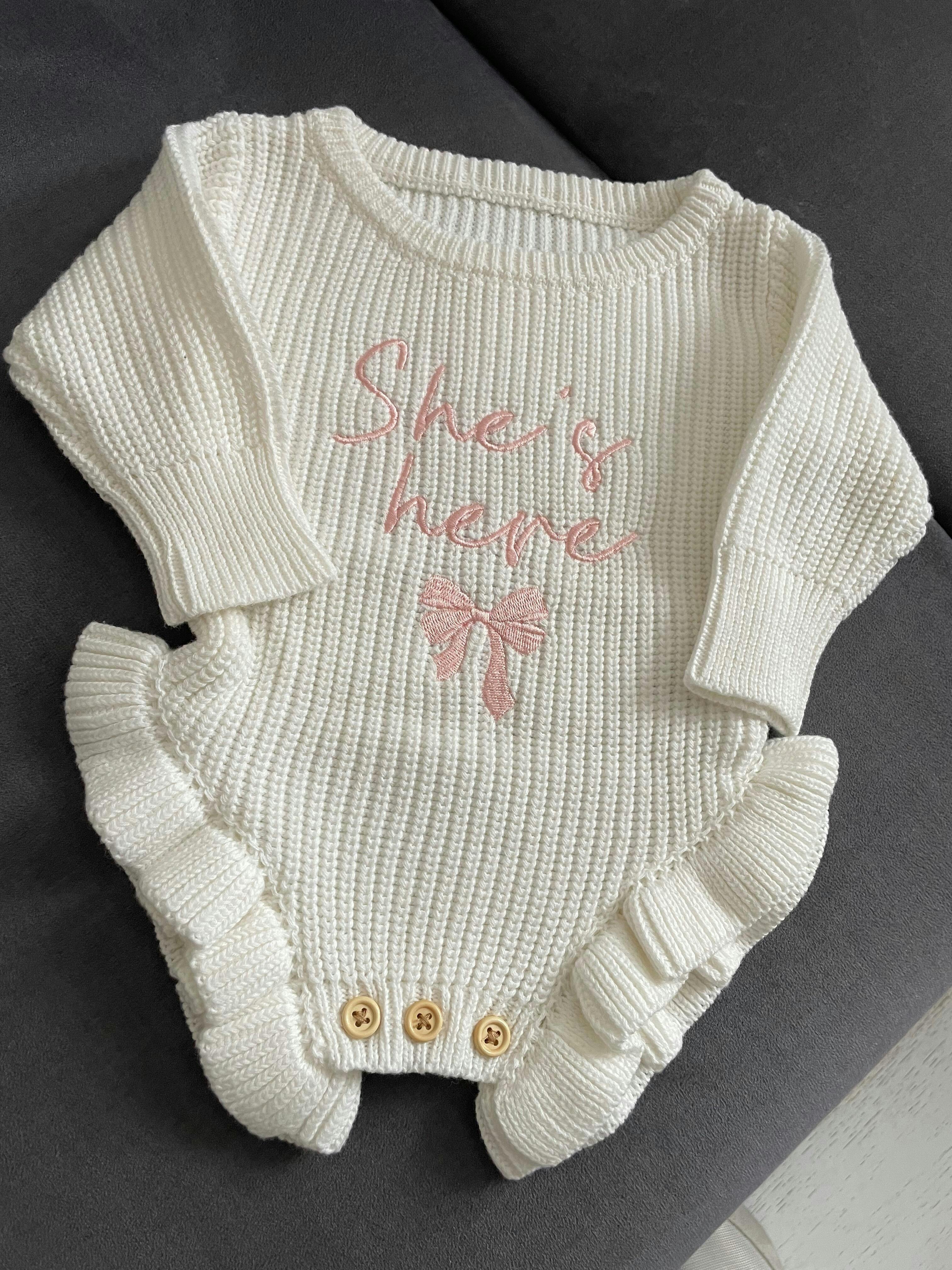 Pagliaccetto con volant sulle gambe e ricamo “She’s here” con fiocco incluso nel prezzo.
